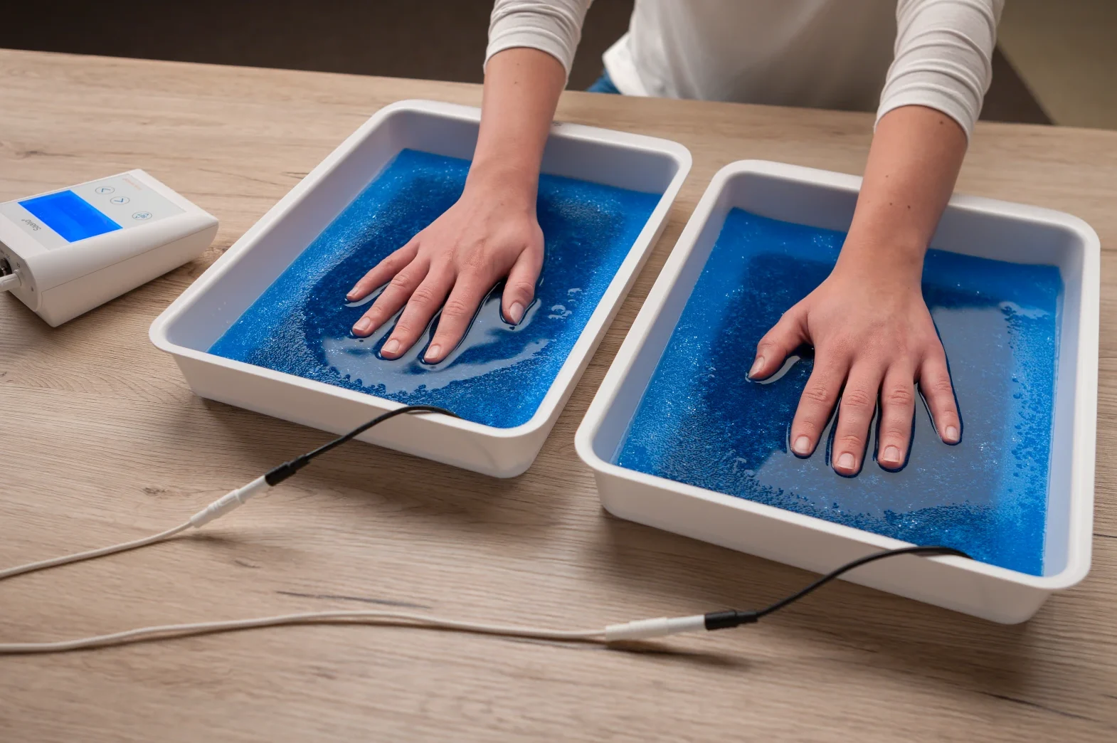 Die Behandlung der Hände und Füße erfolgt in Wannen, auf deren Grund flächige Elektroden gelegt werden. Die Elektroden werden Schäume oder Gitter abgedeckt, die zugleich als Abstandshalter (Wasserpolster) dienen. Schließlich werden die Wannen mit normalen Leitungswasser gefüllt. Der Wasserstand wird so gewählt, dass nur die Handinnenflächen und Fußsohlen mit Wasser benetzt sind. Die schweißreduzierende Wirkung ist auf die mit Wasser benetzten Hautstellen begrenzt.